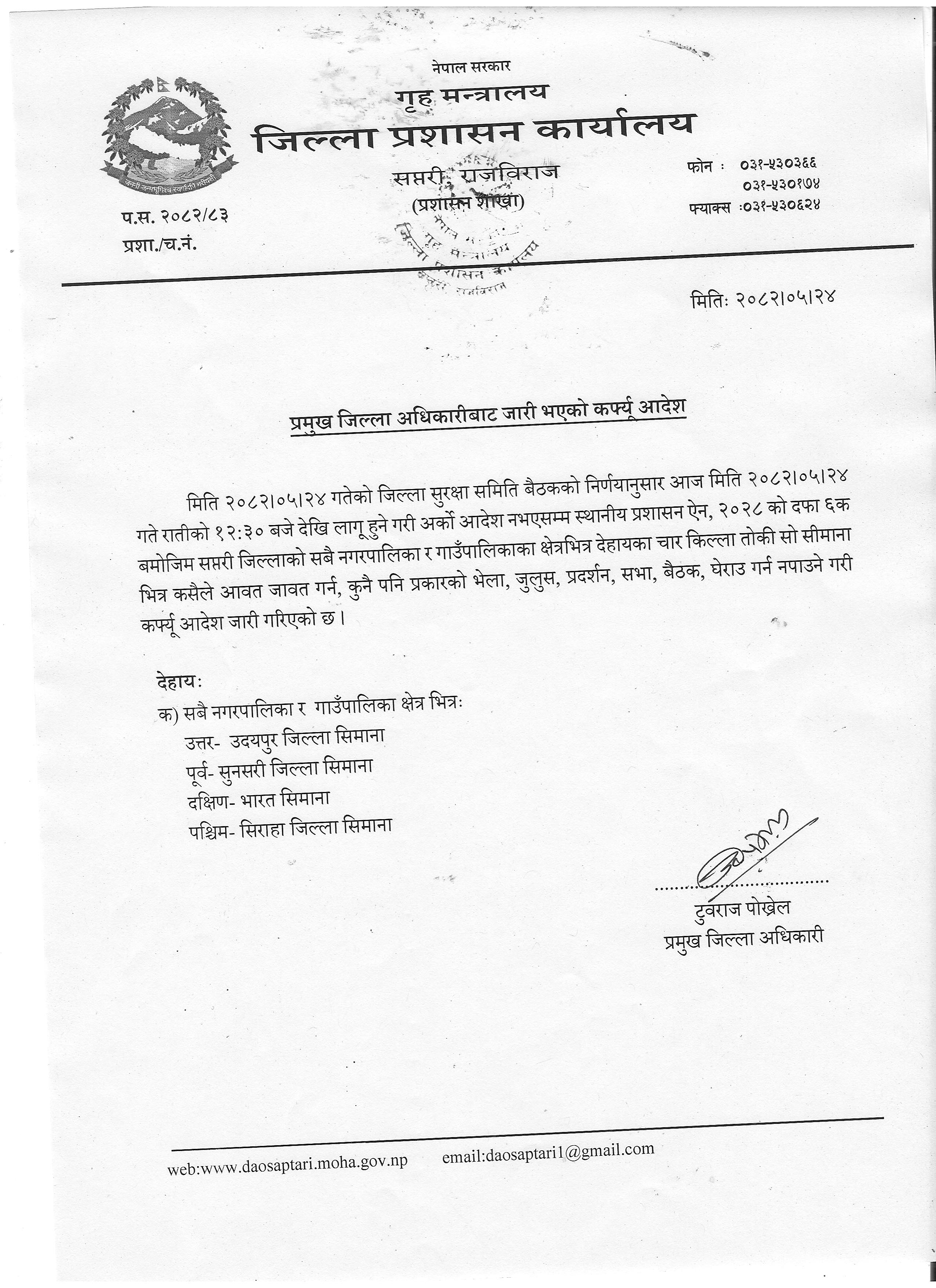 प्रमुख जिल्ला अधिकारीबाट जारी भएको कर्फ्यू आदेश