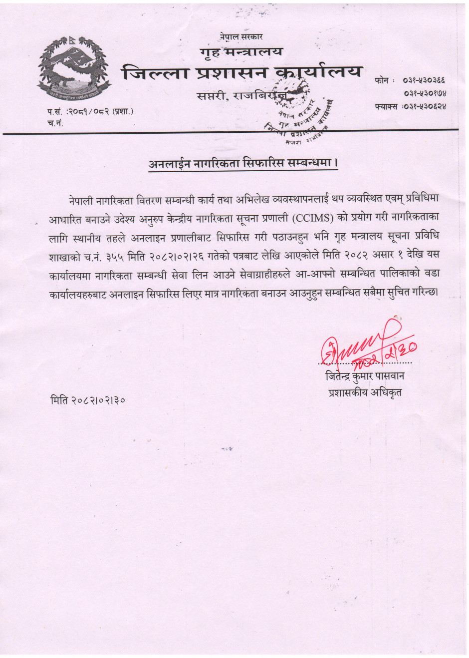 अनलाईन नागरिकता सिफारिस सम्बन्धमा ।
