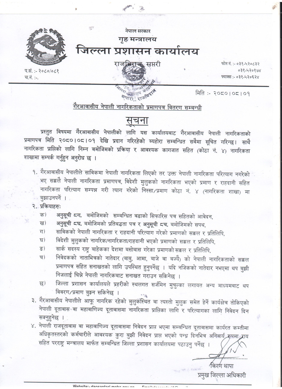 गैर आवासीय नेपालीको लागि नागरिकता बितरण सम्बन्धी सूचना