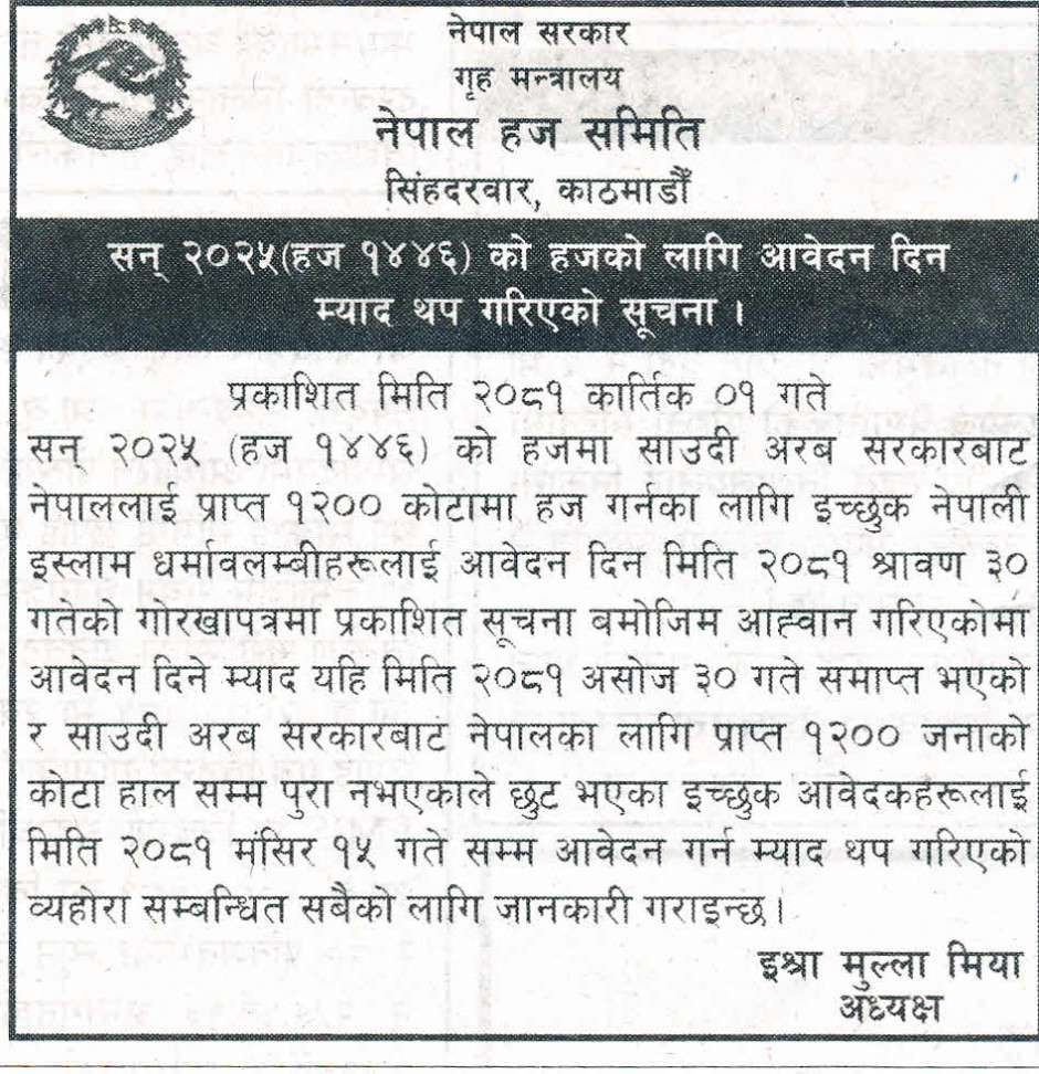 हजको लागि आवेदन दिने म्याद थप गरिएको सूचना ।