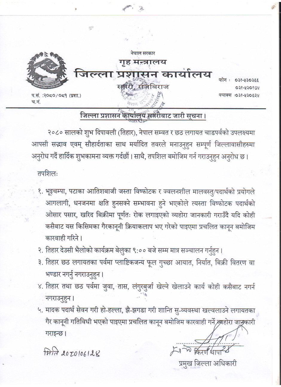 जिल्ला प्रशासन कार्यालय सप्तरीको अत्यन्त जरुरी सूचना ।