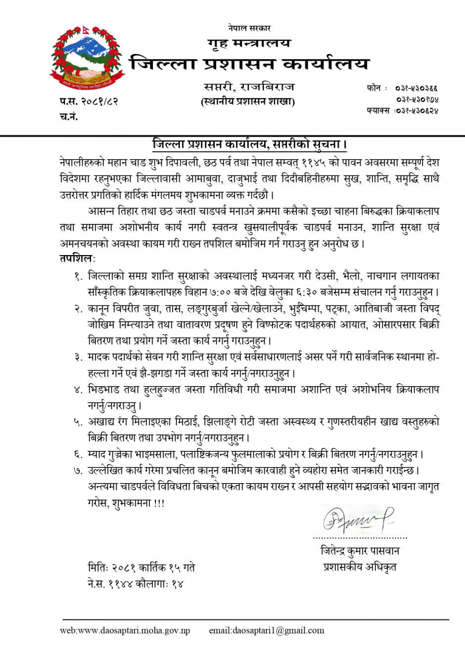 जिल्ला प्रशासन कार्यालय सप्तरीको अत्यन्त जरुरी सूचना