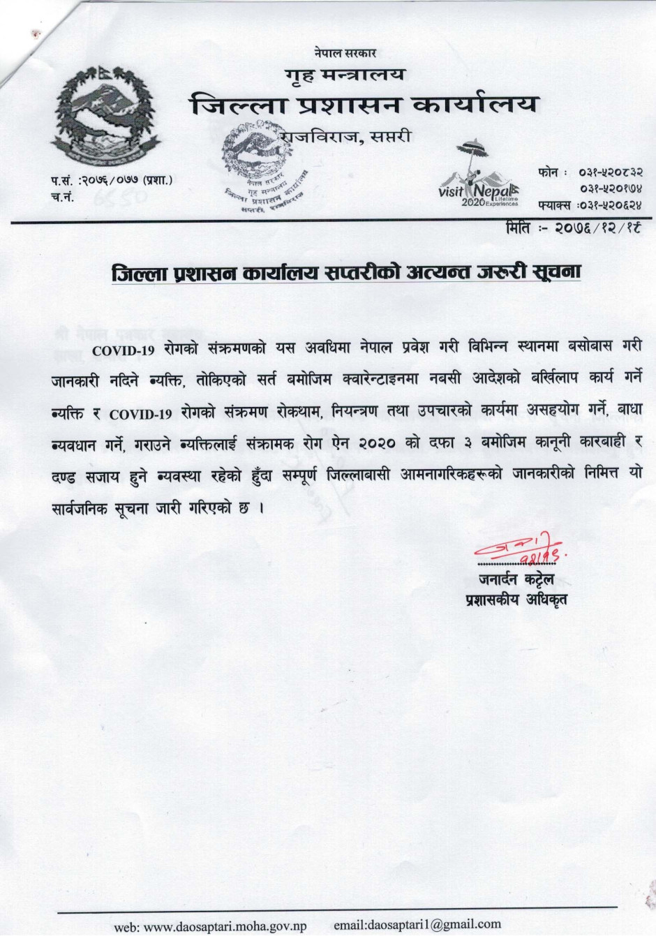 जिल्ला प्रशासन कार्यालय सप्तरीको COVID-19 संक्रमण रोकथाम सम्बन्धी अत्यन्त जरुरी सूचना