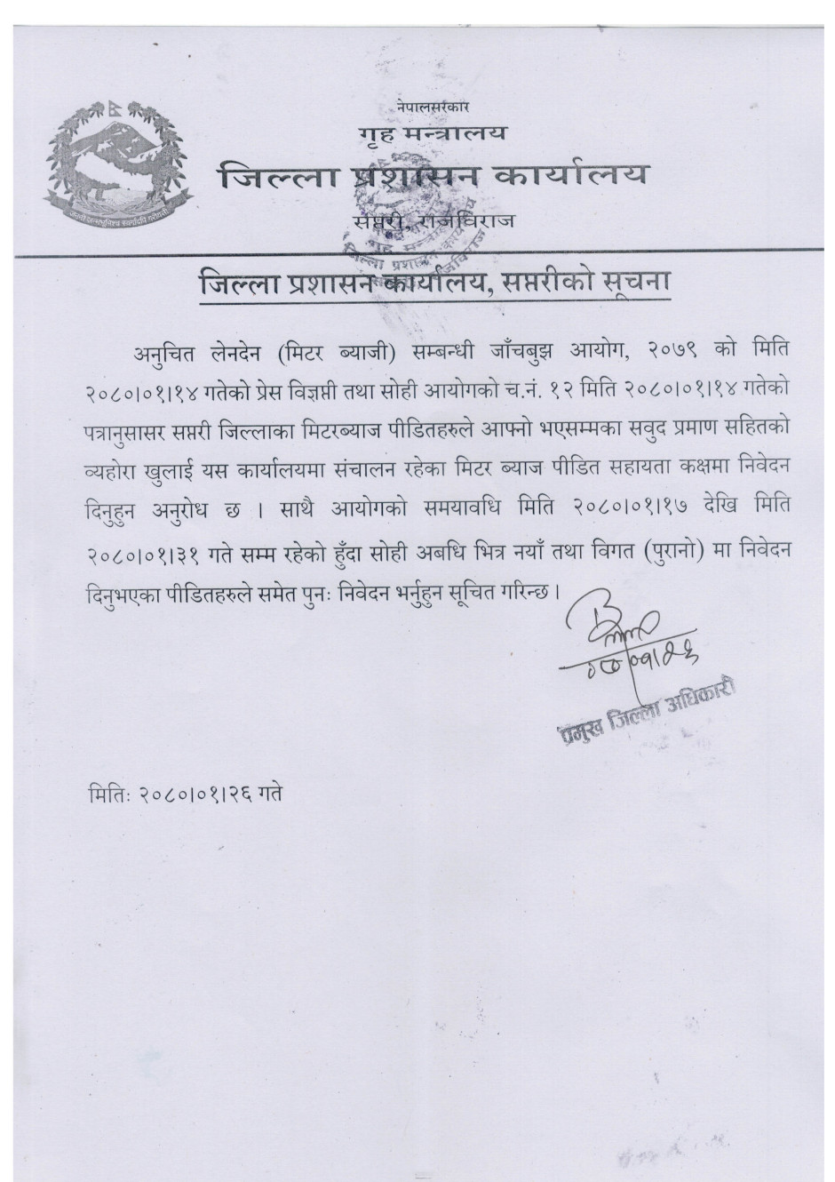 जिल्ला प्रशासन कार्यालय सप्तरीको मिटर ब्याज सम्बन्धी सूचना ।