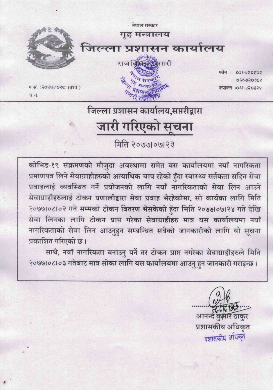 जिल्ला प्रशासन कार्यालय सप्तरीद्बारा जारी गरिएको सेवा प्रवाह सम्बन्धी अत्यन्त जरुरी सूचना