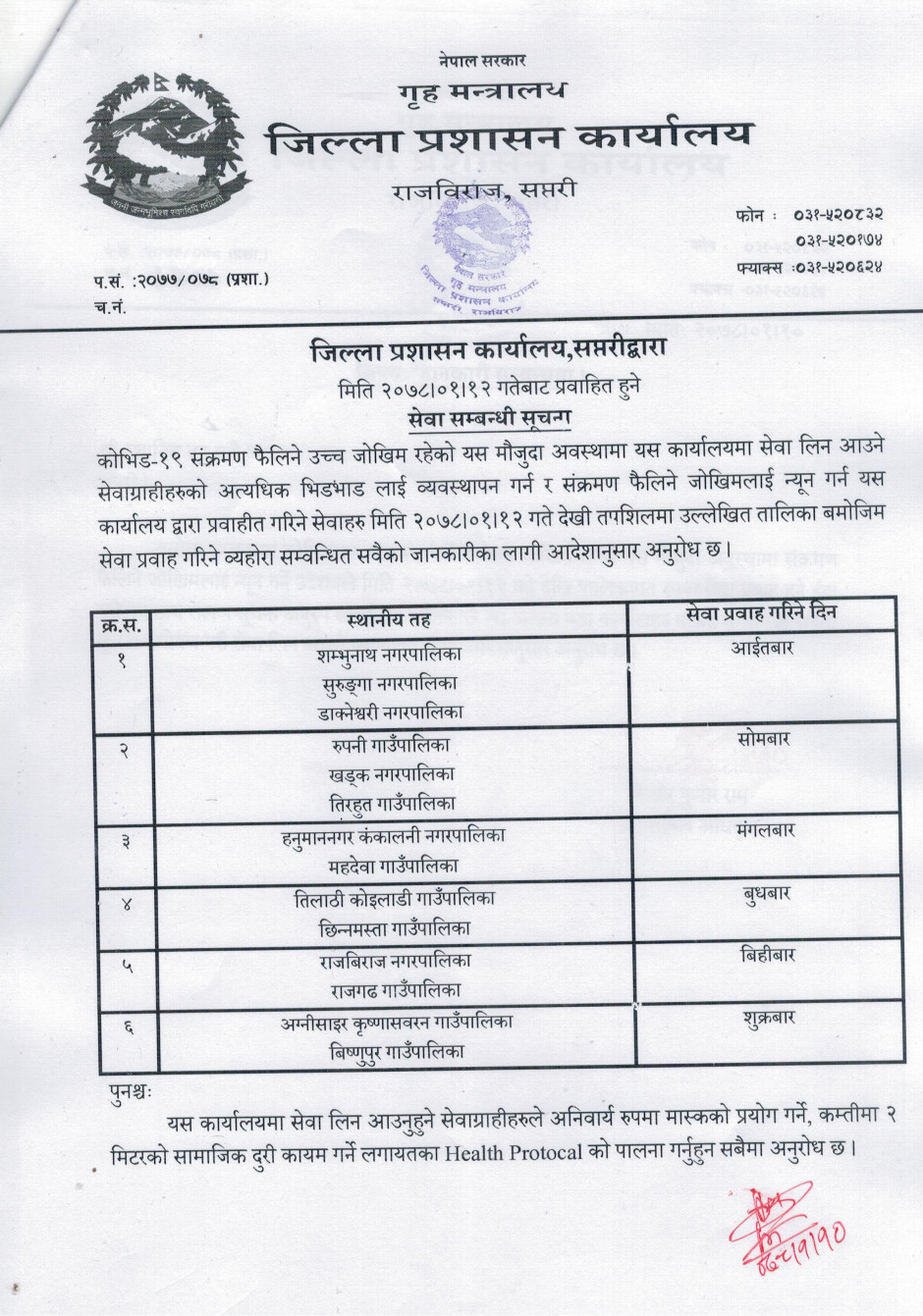 जिल्ला प्रशासन कार्यालय,सप्तरीद्बारा मिति २०७८।०१।१२ गतेबाट प्रवाहित हुने सेवा सम्बन्धी सूचना