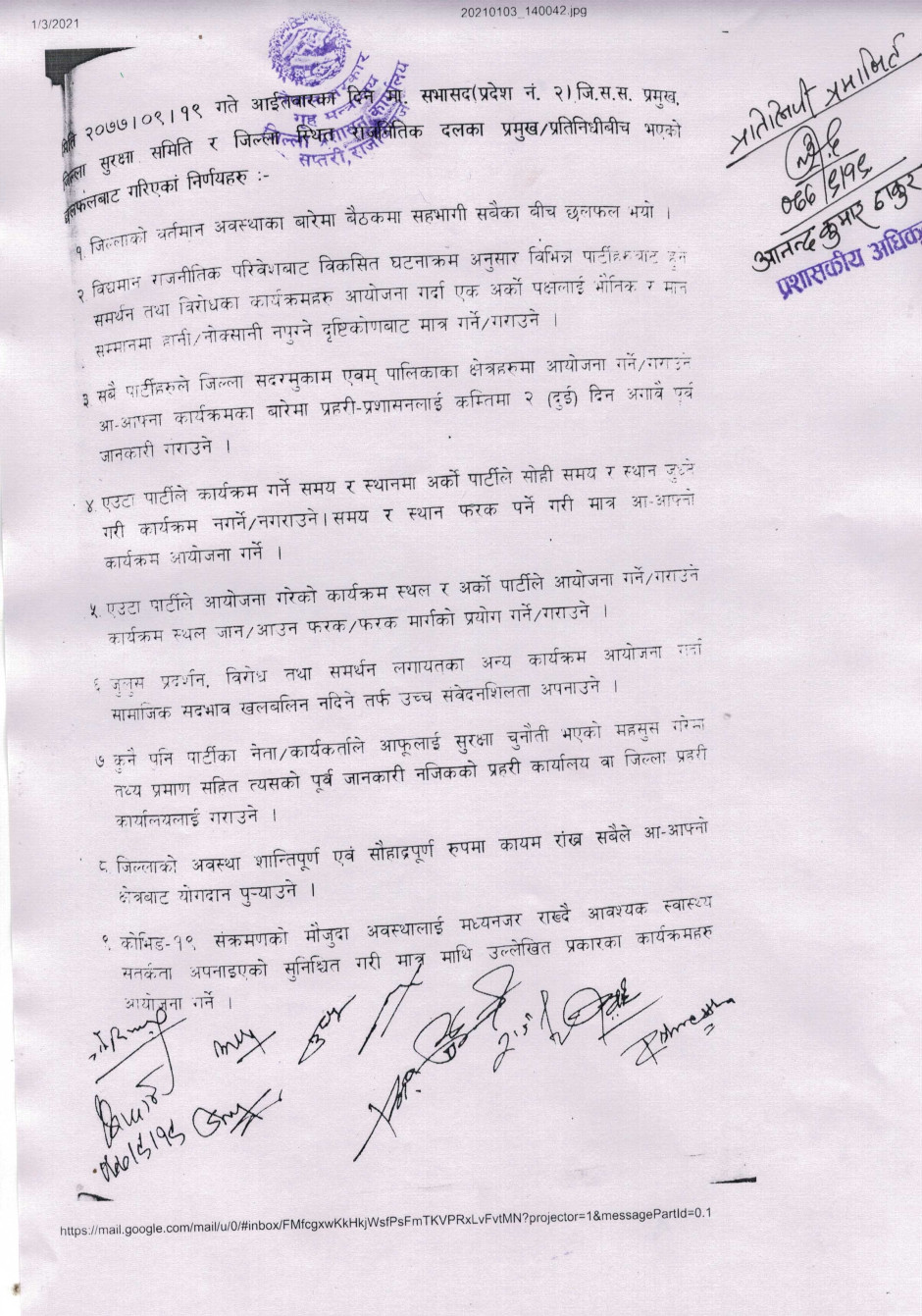 जिल्ला सुरक्षा समिति र जिल्ला स्थित राजनितिक दलका प्रमुख/प्रतिनिधीको मिति २०७७।०९।१९ को संयुक्त बैठकका निर्णयहरु
