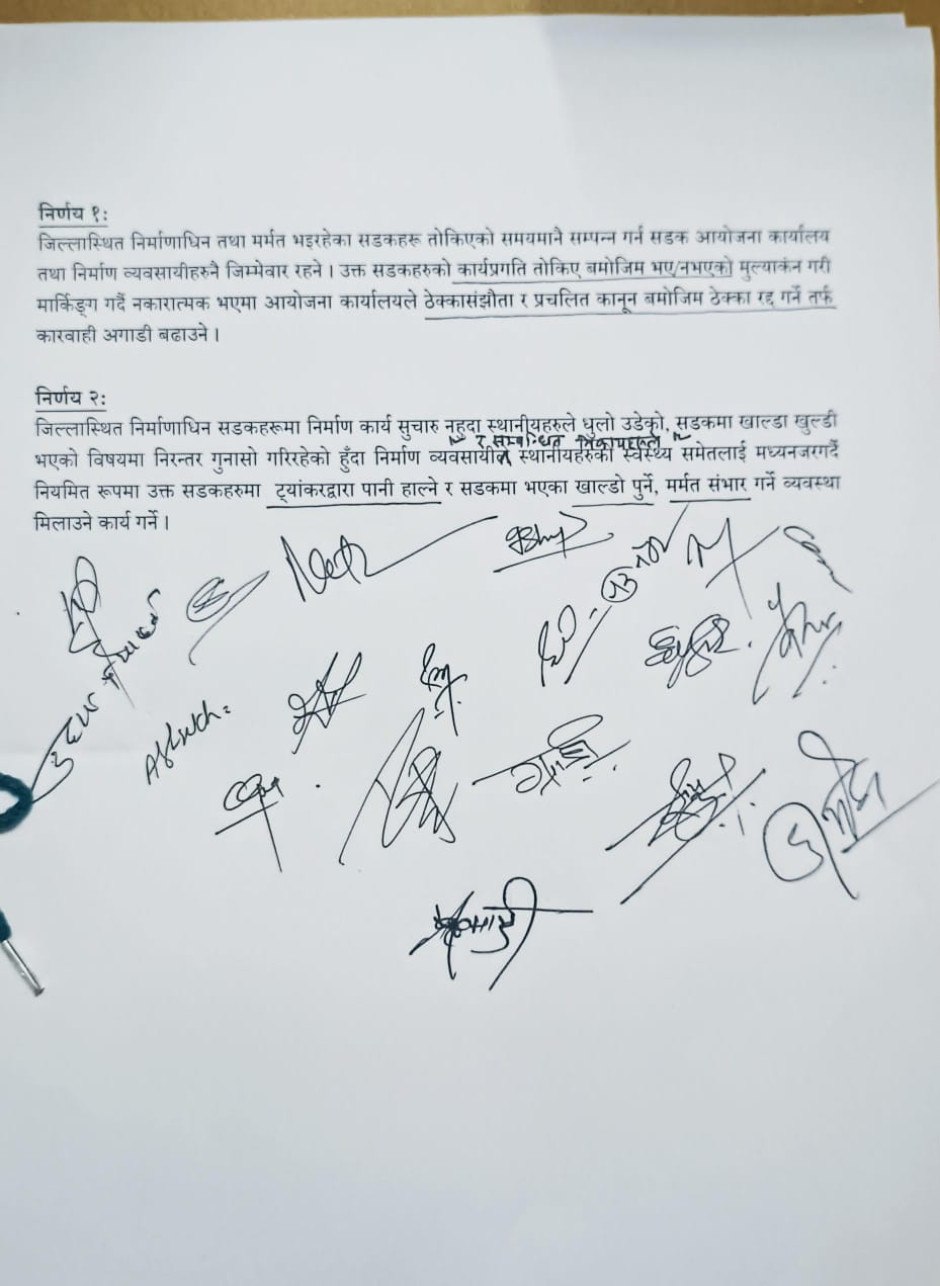 जिल्ला स्थित सडकको निर्माण र मर्मत सम्बन्धमा भएका निर्णयहरु