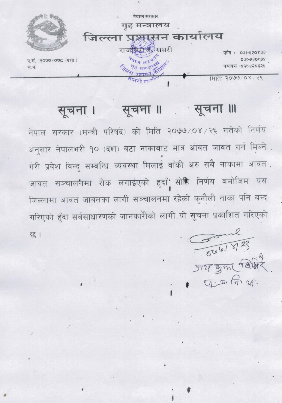 कुनाैली नाका बन्द सम्बन्धी जरुरी सूचना