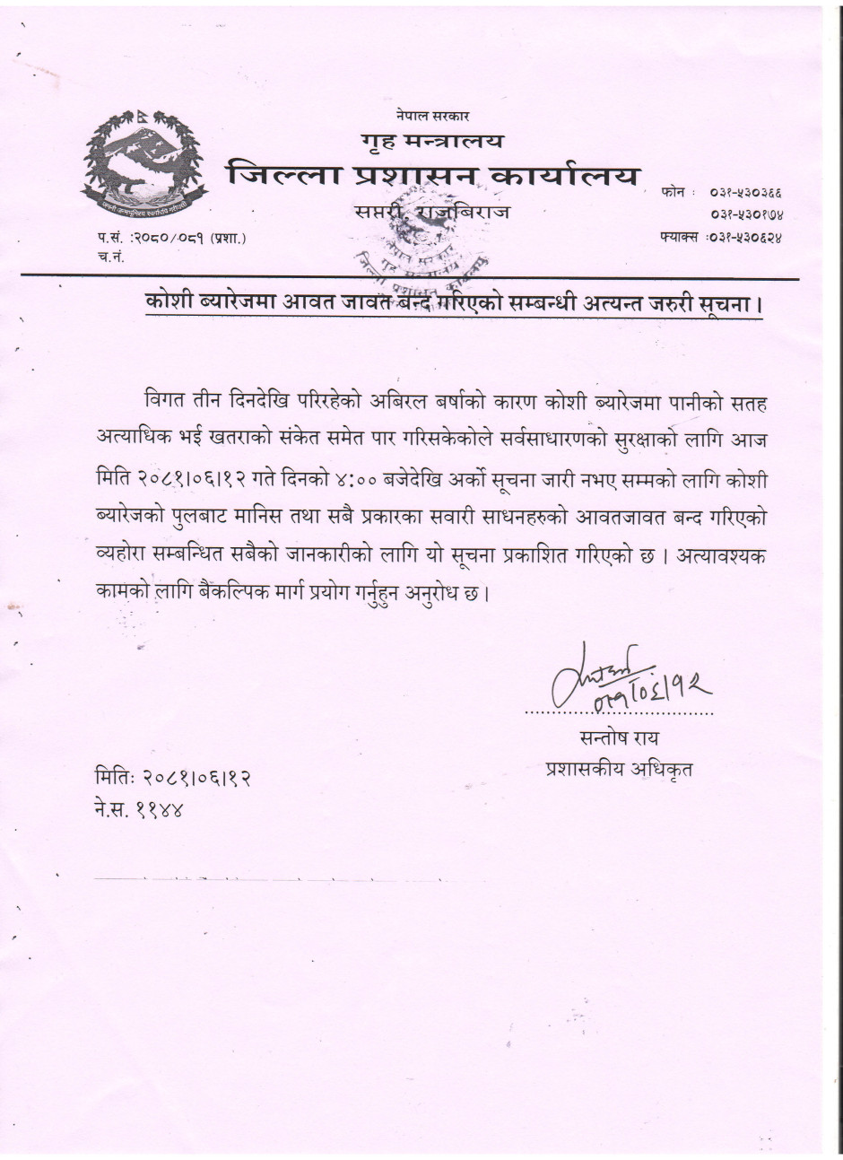 कोशी ब्यारेजमा आवतजावत बन्द गरिएको सम्बन्धी अत्यन्त जरुरी सूचना ।