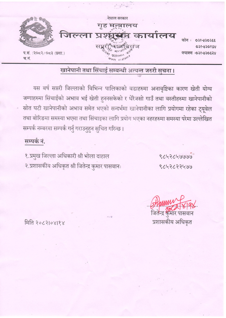 खानेपानी तथा सिंचाई सम्बन्धी अत्यन्त जरुरी सूचना