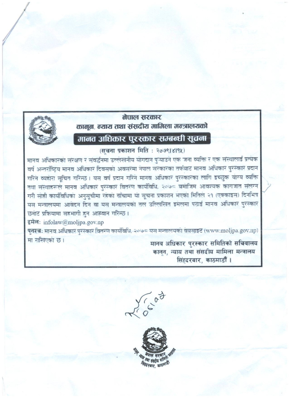 मानव अधिकार पुरस्कार सम्बन्धी सूचना