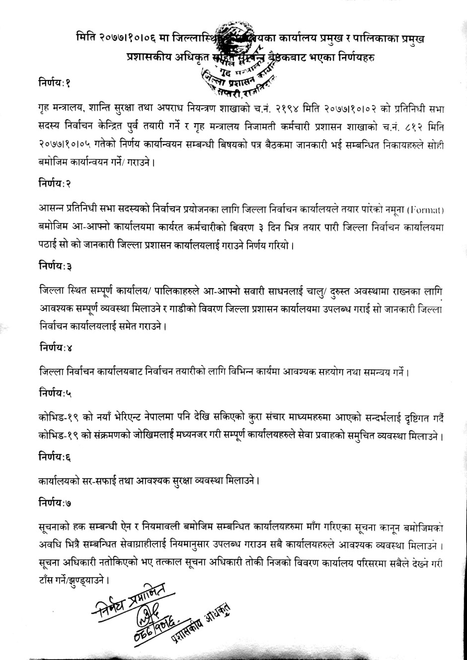 मिति २०७७।१०।०६ गते बसेको स्थानीय तहहरुका प्रमुख प्रशासकीय अधिकृत र सरकारी कार्यालयहरुका कार्यालय प्रमुखको बैठकबाट भएका निर्णयहरु