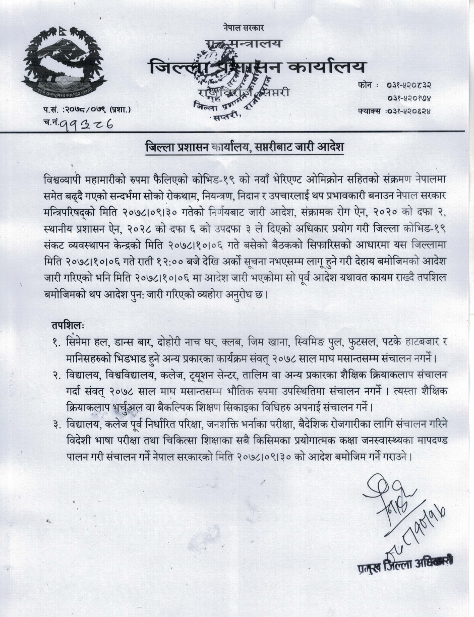 मिति २०७८।१०।१७ गते जिल्ला प्रशासन कार्यालय सप्तरीबाट भएको थप जारी आदेश