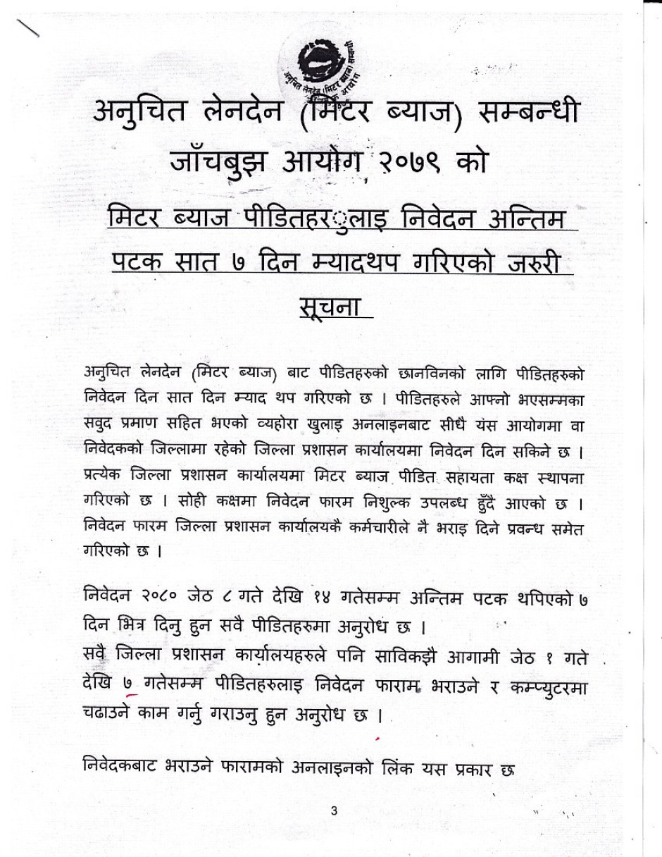 मिटर व्याज पीडितहरुलाई निवेदन पेश गर्नका लागि अन्तिमपटक ७ दिन म्याद थप गरिएको सम्बन्धी सूचना ।