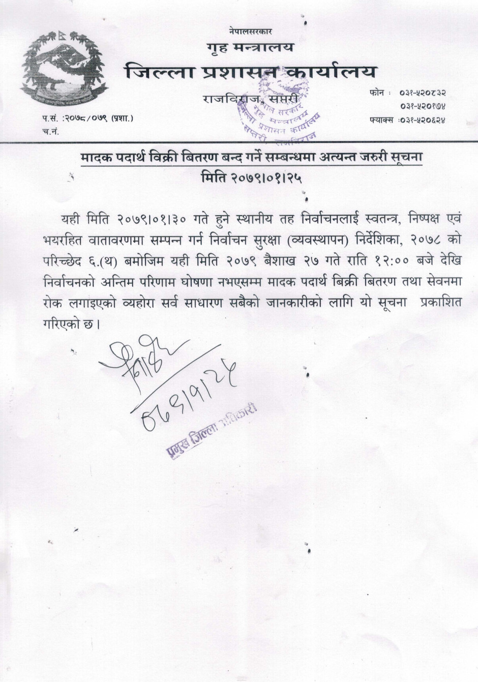 मादक पदार्थ विक्री बितरण बन्द गर्ने सम्बन्धमा अत्यन्त जरुरी सूचना ।