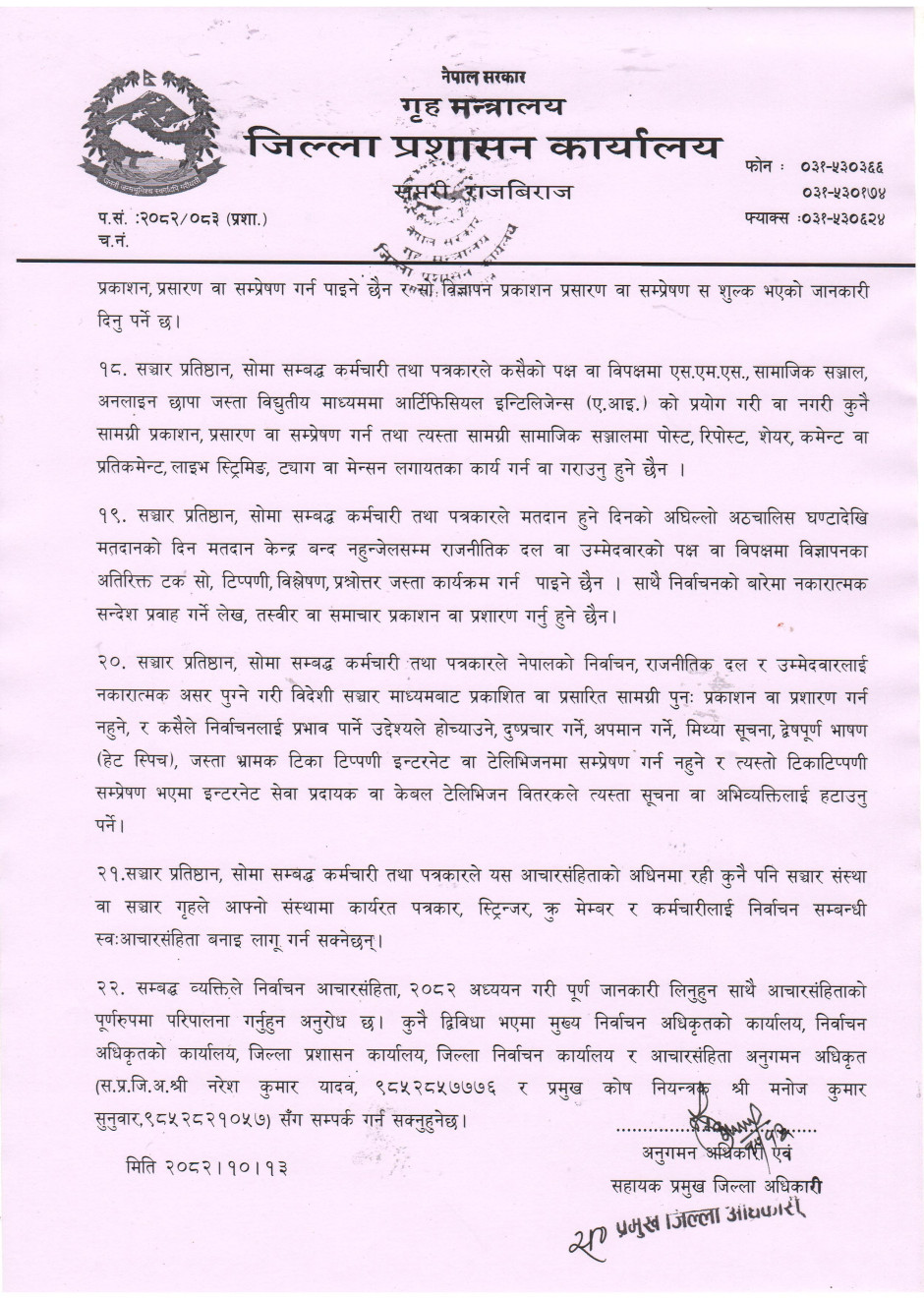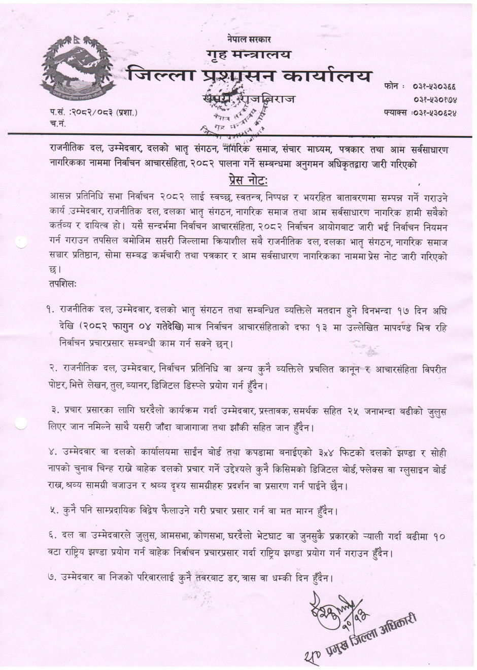 निर्वाचन आचार संहिता, २०८२ पालना गर्ने सम्बन्धमा जारी गरिएको प्रेस नोटः