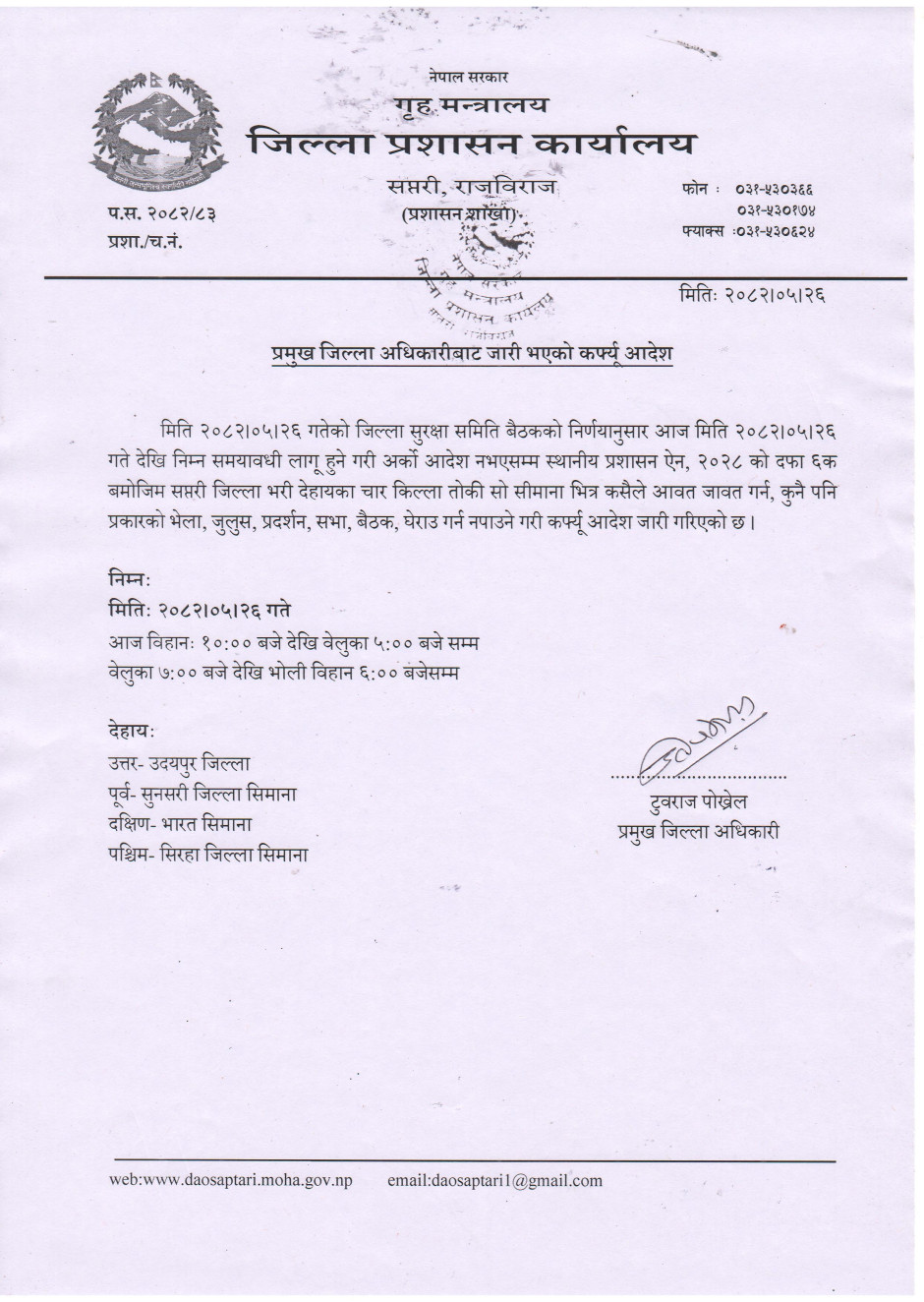 प्रमुख जिल्ला अधिकारीबाट जारी भएको कर्फ्यू आदेश