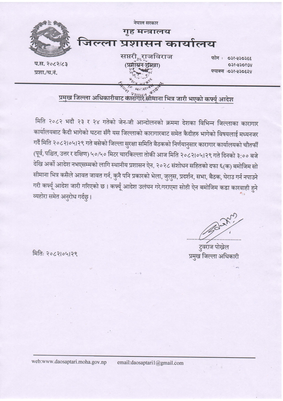 प्रमुख जिल्ला अधिकारीबाट कारागार सीमाना भित्र जारी भएको कर्फ्यू आदेश