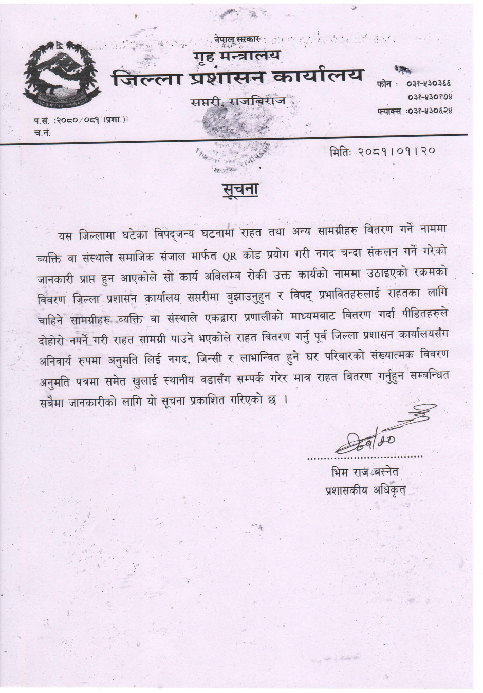 राहत बितरण सम्बन्धमा अत्यन्त जरुरी सूचना ।