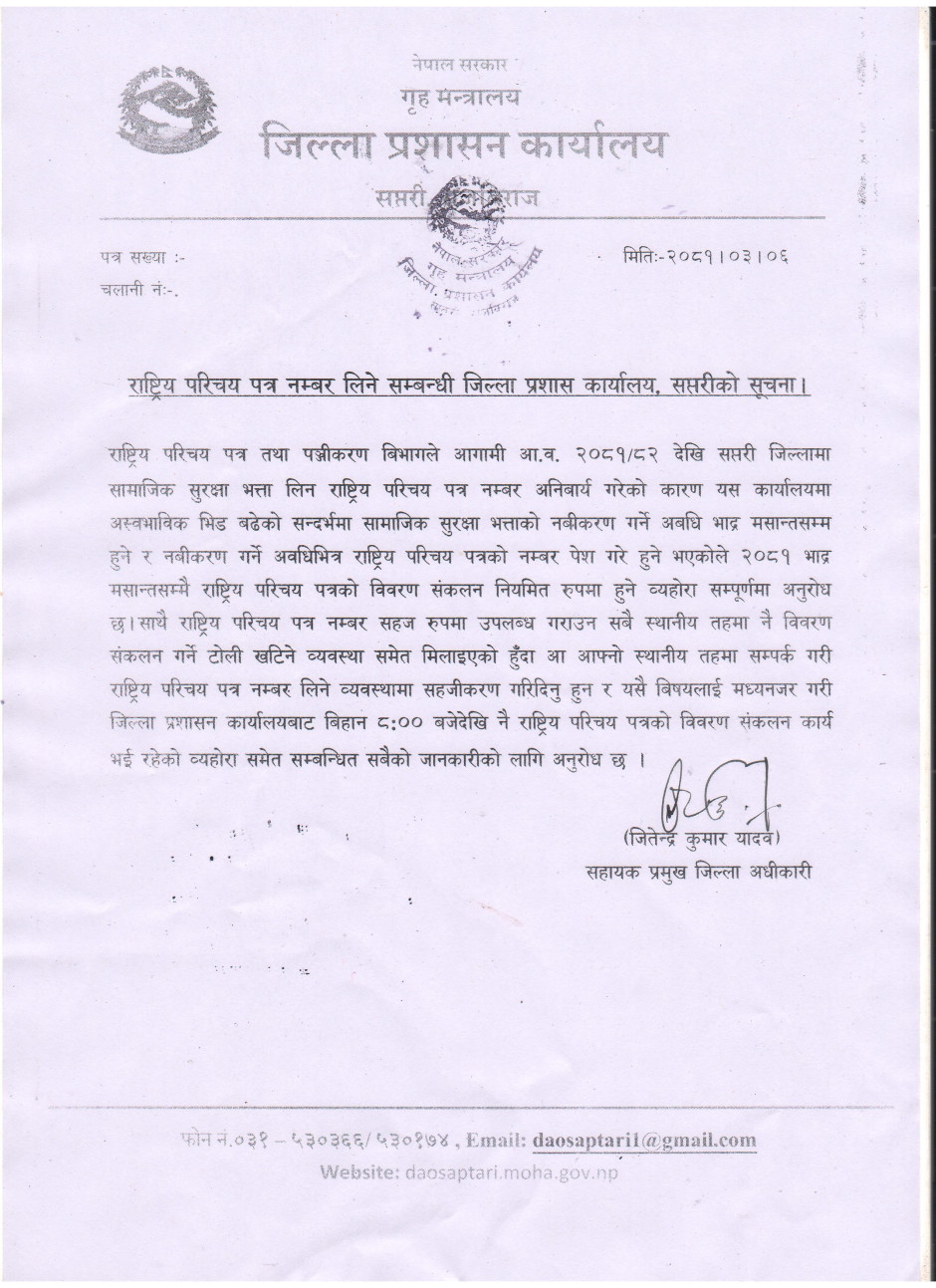राष्ट्रिय परिचयपत्र नम्बर लिने सम्बन्धी जिल्ला प्रशासन कार्यालय, सप्तरीको सूचना ।