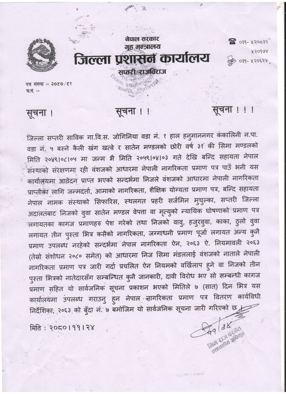 © सर्वाधिकार सुरक्षित जिल्ला प्रशासन कार्यालय, सप्तरी
