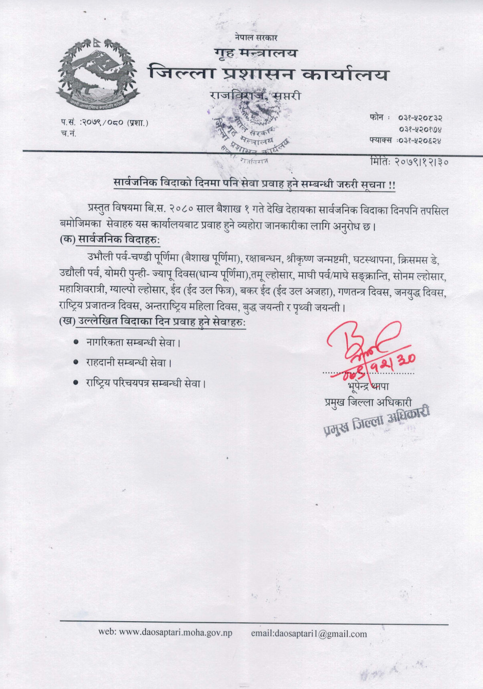 सार्वजनिक विदाको दिनमा पनि सेवा प्रवाह हुने सम्बन्धी जरुरी सूचना ।