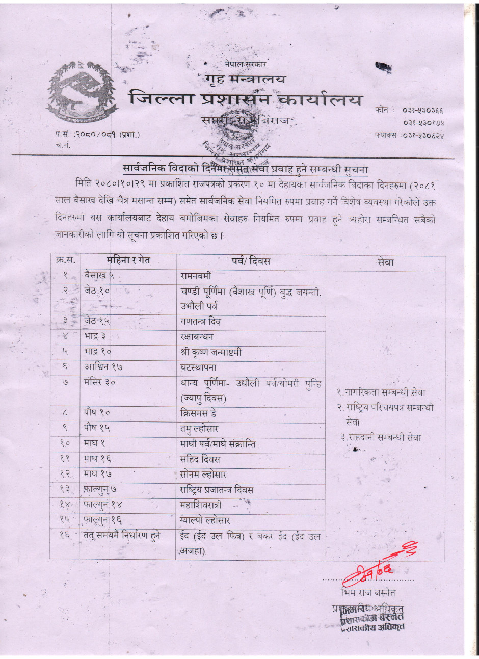 सार्वजनिक विदाको दिनमा समेत सेवा प्रवाह हुने सम्बन्धी सुचना