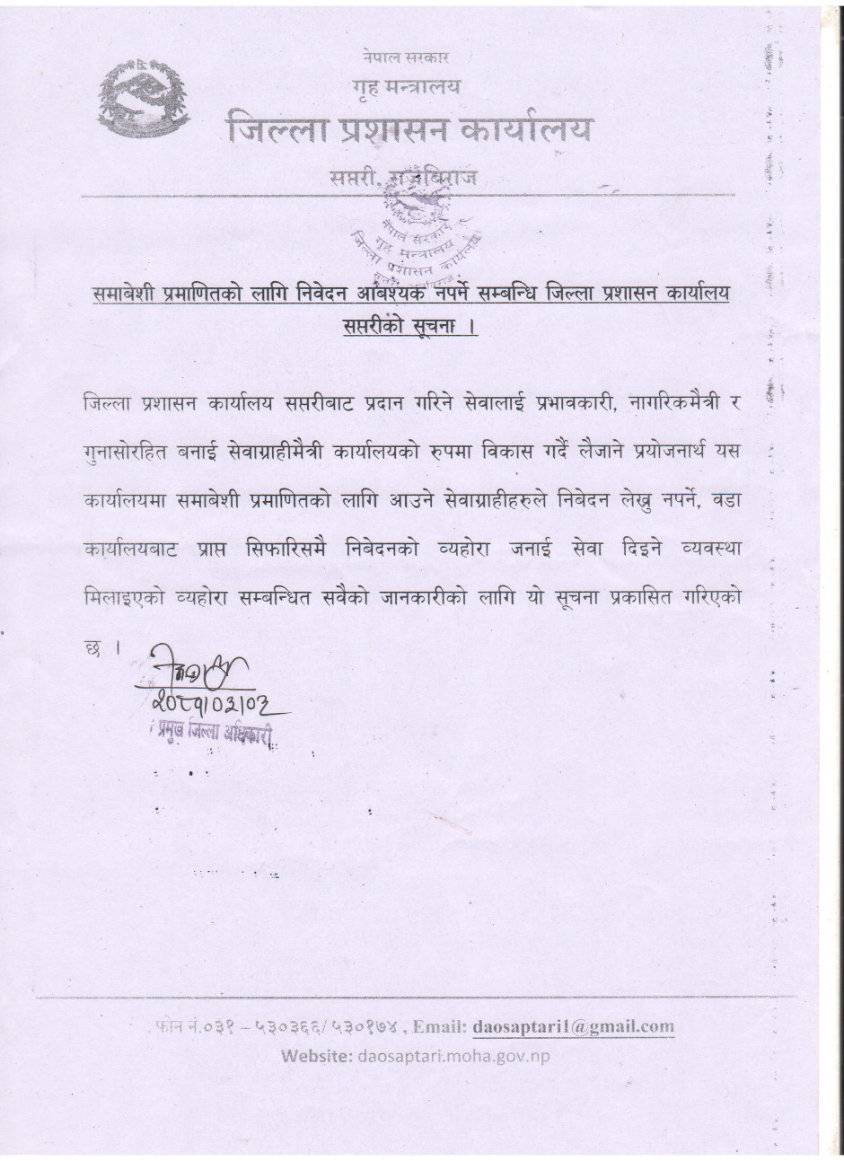 © सर्वाधिकार सुरक्षित जिल्ला प्रशासन कार्यालय, सप्तरी