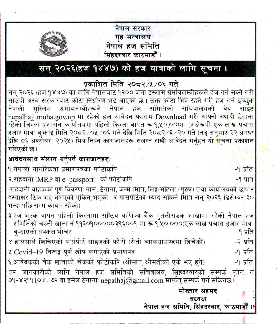 सन् २०२६ (हज १४४७) को हज यात्राको लागि सूचना ।