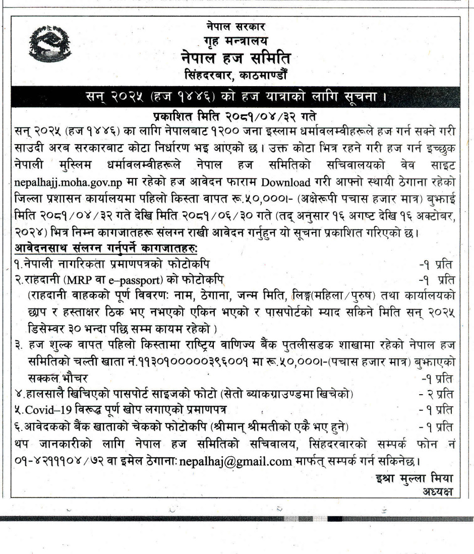 सन् २०२५ (हज १४४६) को हज यात्राको लागि सूचना ।