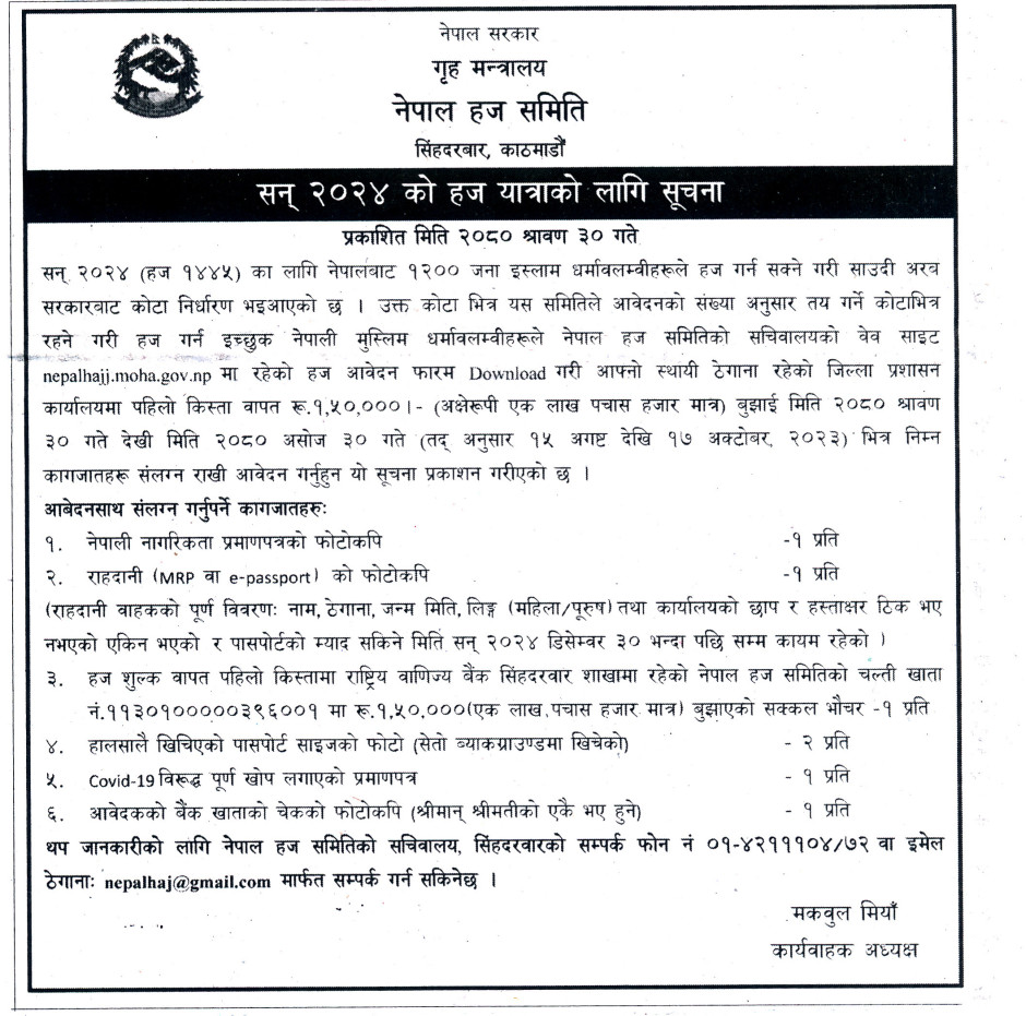 सन् २०२४ को हज यात्रा सम्बन्धी सूचना ।