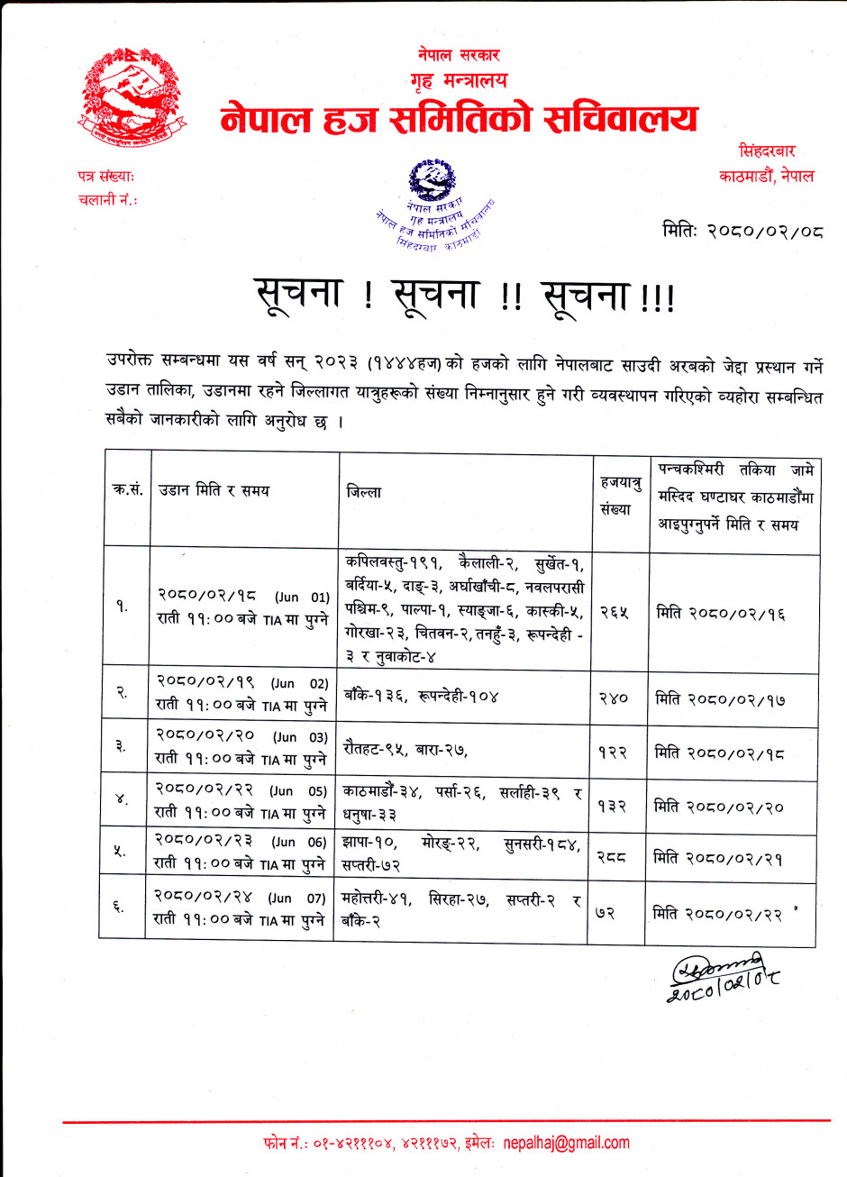 सन् २०२३ मा हुने हजको लागि उडान तालिका