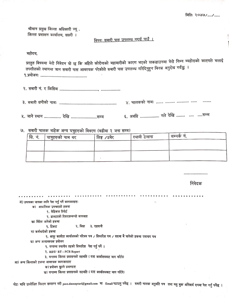 सवारी पासको लागि निवेदनको ढाँचा