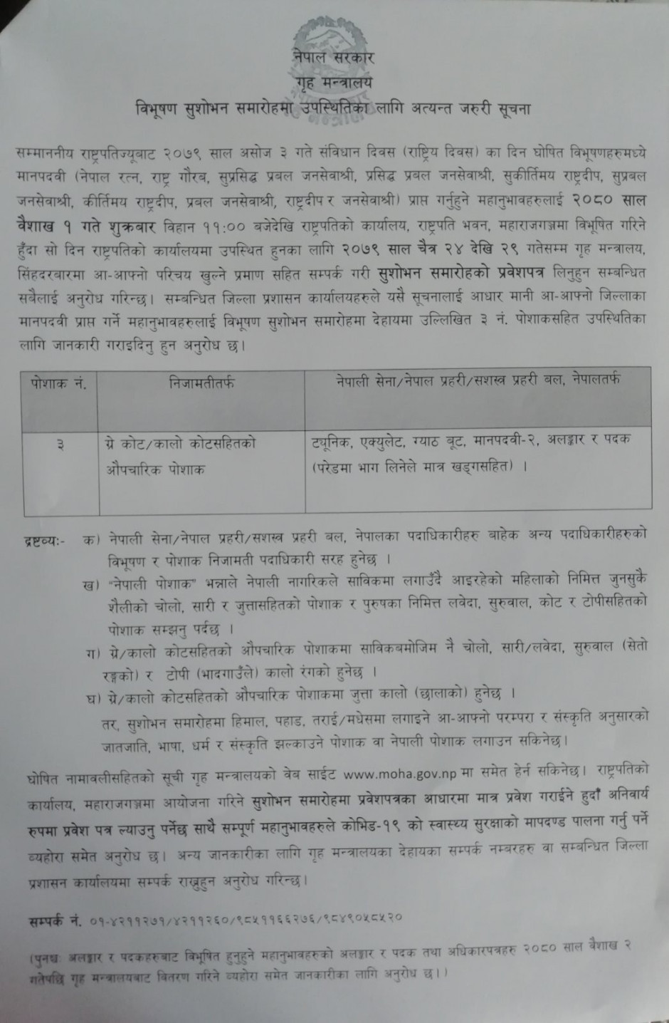 विभूषण सुशोभन समारोहमा उपस्थितका लागि अत्यन्त जरुरी सूचना ।